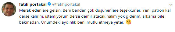 "Merak edenlere gelsin: Beni benden çok düşünenlere teşekkürler. Yeni patron kal derse kalırım, istemiyorum derse demir atacak halim yok giderim, arkama bile bakmadan. Önümdeki aydınlık beni mutlu etmeye yeter."