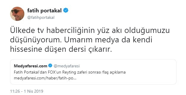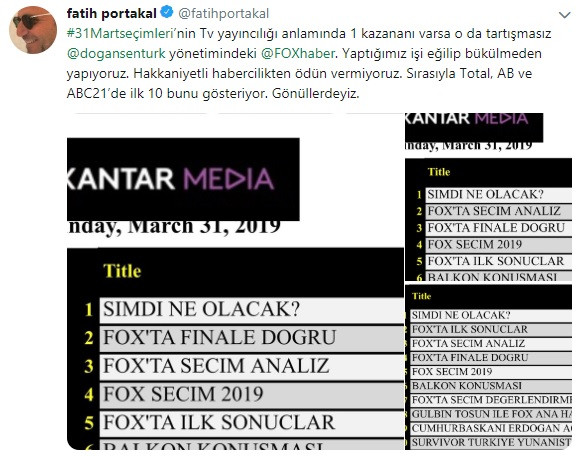 Reyting sonuçlarının açıklanmasının ardından Fatih Portakal sosyal medya hesabından açıklama yaptı. Portakal yaptığı açıklamada, "#31Martseçimleri’nin Tv yayıncılığı anlamında 1 kazananı varsa o da tartışmasız @dogansenturk yönetimindeki @FOXhaber. Yaptığımız işi eğilip bükülmeden yapıyoruz. Hakkaniyetli habercilikten ödün vermiyoruz. Sırasıyla Total, AB ve ABC21’de ilk 10 bunu gösteriyor. Gönüllerdeyiz." ifadelerini kullandı.