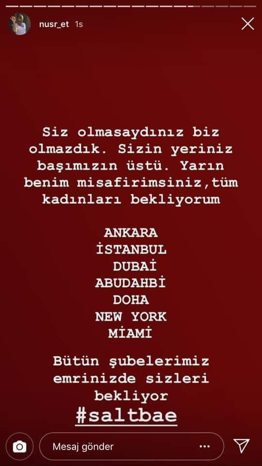 Nusret jestini "Siz olmasaydınız biz olmazdık. Sizin yeriniz başımızın üstü. Yarın benim misafirimsiniz, tüm kadınları bekliyorum. Ankara, İstanbul, Dubai, Abdudahbi, Doha, New York, Miami bütün şubelerimiz emrinizde sizleri bekliyor" mesajıyla duyurdu.